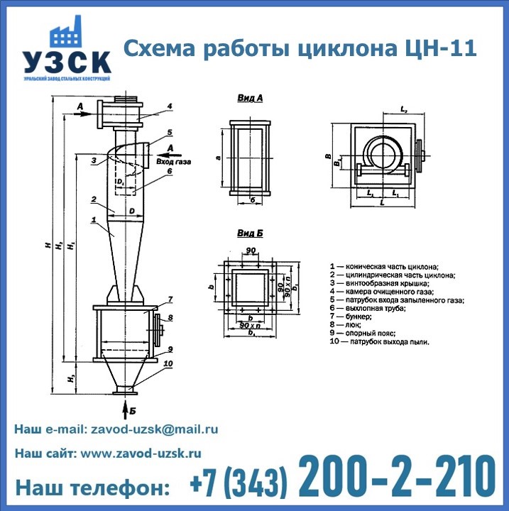 При этом ощутимой разницы в цене между универсальным и узконаправленным, подобранным в соответствии с конкретными техническими требованиями циклоном, нет. Стоимость воздухоочистительного оборудования типа циклон обусловлена маркой и толщиной стали, из которого он изготовлен, сложностью и специфичностью конструкции, наличием дополнительного оснащения (бункер, улитка и другие). При необходимости, на заводе УЗСК в Стерлитамаке будет изготовлен циклон по индивидуальным техническим чертежам заказчика.